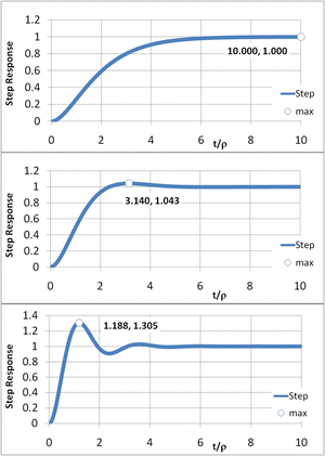The amplitude of ringing in the step response in Figure 3 is governed by the damping factor exp (−ρ t). That is, if we specify some acceptable step response deviation from final value, say Δ, that is: