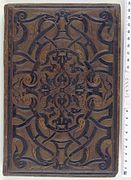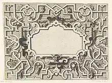 European strapwork is a frequent background and framework for grotesque ornament – arabesque or candelabra figures filled with fantastical creatures, garlands and other elements – which were a frequent decorative motif in 16th-century Northern Mannerism, and revived in the 19th century and which may appear on walls – painted, in frescos, carved in wood, or moulded in plaster or stucco – or in graphic work.[2] The Europeanized arabesque patterns called moresque are also very often combined with strapwork, especially in tooled and gilded bookbindings.