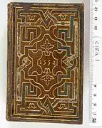 Strapwork designs, influenced by Islamic ornament, are found on tooled book-covers in Italy and Spain by the mid-15th century, and in other media by the early 16th century, for example in the Raphael Loggie in the Vatican.[5] By the time the First School of Fontainebleau had spread their very emphatic version of the style to northern Europe, the Italians had largely abandoned it, although it remained common on fine decorated bookbindings in Italy as elsewhere, often combined with moresque decoration.