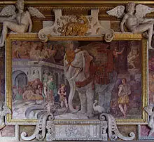 Strapwork was found earlier, but really came to prominence after it was used in stucco in the enormous elaborate decorative frames designed by Rosso Fiorentino and his team for the Palace of Fontainebleau in the 1530s. Thereafter, spread by prints, it became part of the vocabulary of Northern Mannerist ornament.[8]