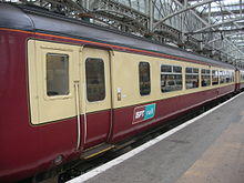 In August 2008 the Scottish Government's agency Transport Scotland announced that all ScotRail trains (including from the Strathclyde Partnership for Transport) would be eventually repainted in a new, blue livery with white Saltire markings on the carriage ends. This will, in due course, lead to the elimination of the distinctive SPT carmine and cream livery from trains.[3] In the Autumn of 2008 some trains, including the Class 156, 314 and 318 have had their "SPT Rail" logos removed. In February 2018 ScotRail announced that over the year the 1979 vintage Class 314 will be withdrawn from service as the new Class 385 enters service.[4] As of January 2020, no passenger rolling stock carries the SPT carmine and cream livery following withdrawal of the Class 314s in December 2019 and the last Class 318, 318 268 being reliveried in 2017.