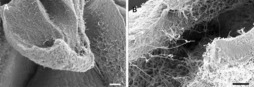 The genus Streptomyces includes aerobic, Gram-positive, filamentous bacteria that produce well-developed vegetative hyphae (between 0.5-2.0 µm in diameter) with branches. They form a complex substrate mycelium that aids in scavenging organic compounds from their substrates.[11] Although the mycelia and the aerial hyphae that arise from them are amotile, mobility is achieved by dispersion of spores.[11] Spore surfaces may be hairy, rugose, smooth, spiny or warty.[12] In some species, aerial hyphae consist of long, straight filaments, which bear 50 or more spores at more or less regular intervals, arranged in whorls (verticils). Each branch of a verticil produces, at its apex, an umbel, which carries from two to several chains of spherical to ellipsoidal, smooth or rugose spores.[11] Some strains form short chains of spores on substrate hyphae. Sclerotia-, pycnidia-, sporangia-, and synnemata-like structures are produced by some strains.