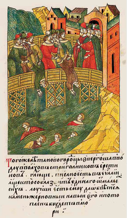 - ^ Some scholars see this as an execution after the heretics were condemned by Archbishop Aleskei (r. 1359–1388), but others see it as a lynching. See B. A. Rybakov, Strigolniki, 4-11.