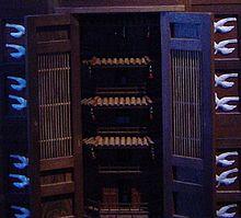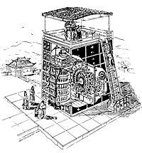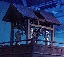 Su Song's greatest project was the 40-foot-tall water-powered astronomical clock tower constructed in Kaifeng, the wooden pilot model completed in 1088, the bronze components cast by 1090, while the wholly finished work was completed by 1094 during the reign of Emperor Zhezong of Song.[41][42] The emperor had previously commissioned Han Gonglian, Acting Secretary of the Ministry of Personnel, to head the project, but the leadership position was instead handed down to Su Song. The emperor ordered in 1086 for Su to reconstruct the hun yi, or "armillary clock", for a new clock tower in the capital city. Su worked with the aid of Han Gong-lian, who applied his extensive knowledge of mathematics to the construction of the clock tower.[43] A small-scale wooden model was first crafted by Su Song, testing its intricate parts before applying it to an actual full-scale clock tower.[44] In the end, the clock tower had many impressive features, such as the hydro-mechanical, rotating armillary sphere crowning the top level and weighing some 10 to 20 tons,[44] a bronze celestial globe located in the middle that was 4.5 feet in diameter,[44] mechanically-timed and rotating mannequins dressed in miniature Chinese clothes that exited miniature opening doors to announce the time of day by presenting designated reading plaques, ringing bells and gongs, or beating drums,[45] a sophisticated use of oblique gears and an escapement mechanism,[46] as well as an exterior facade of a fanciful Chinese pagoda. Upon its completion, the tower was called the Shui Yun Yi Xiang Tai, or "Tower for the Water-Powered Sphere and Globe". Joseph Needham writes:
