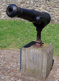 Swivel guns are among the smallest types of cannon, typically measuring less than 1 m (3.3 ft) in length and with a bore diameter of up to 3.5 cm (1 1&fras1;2 in). They can fire a variety of ammunition but were generally used to fire grapeshot and small caliber round shot.[3] They were aimed through the use of a wooden handle, somewhat similar in shape to a baseball bat, attached to the breech of the weapon.