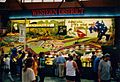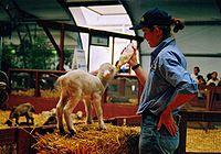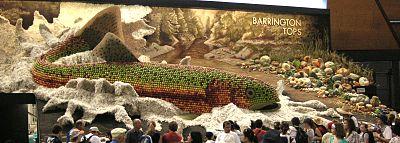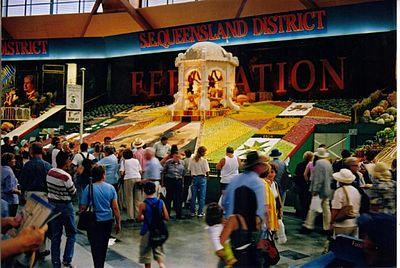 The first purpose of the show is specifically to encourage agriculture. Although other aspects of the show have developed including competitions, entertainment and commerce, the display of the products of rural industry remain of major importance, the RAS claiming 30,000 rural exhibits in 2007.[8] One of the most popular sights at the show is the "District Exhibits" competition. These displays are set up by four districts of NSW and South East Queensland. A theme is selected and created pictorially on a large scale, to strict rules and using only the produce of the particular district which typically includes wool, wheat, apples, pumpkins, sugar cane, citrus fruit, vegetables and brightly coloured bottles of preserves. Sydney Royal Judges scrutinise every element individually – grains, pulses, fruit, oils, vegetables, fibre – to determine who has the best in each region. Points from the different sections plus the extra points for General Presentation and Effective Display are added together to determine the overall winner. Attendees are also able to buy produce from the farmers at the front of the exhibits.