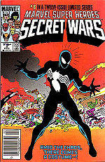 During the Kree-Skrull War, the Kree wanting to replicate the Skrull's shapeshifting abilities, they acquired a newborn symbiote which had been outcast from the other symbiotes, on the planet where Knull had created them.[13] They recruited Tel-Kar to be bonded to the young symbiote and modified both Tel-Kar and the symbiote so he could have full control over it. He infiltrated into the Skrulls using the symbiote's shapeshifting ability, but got discovered. He deleted the symbiote's memories and separated himself from it.[14] The symbiote then reunited with the parasitic symbiotes, while retaining little memory of its first host. When the corrupted symbiotes found out that this symbiote wanted to commit to its host rather than exploit it as they tended to do, they decided that it was it insane and trapped it in a canister to be condemned to die on a planet that would later become part of Beyonder's Battleworld, where it would be encountered by Spider-Man in the 1984 miniseries Secret Wars. In that story, which saw the heroes of Earth transported there to battle their archenemies,[15] Spider-Man sought to repair or replace his tattered costume, which had been damaged in battle, and was directed by Thor and Hulk to a device in the alien compound that they had come to use as headquarters. Mistaking the device in which the symbiote was imprisoned for the device Thor and Hulk mentioned, Spider-Man activated it, freeing the symbiote, which appeared before him as a black sphere that enveloped his body, taking on the form of a black version of his costume that could respond to his mental commands. From this Spider-Man assumed that the device produced clothing designed to do this.[16] At the conclusion of that miniseries, he returned to Earth, not knowing that the new costume he acquired was an alien being who desired to permanently bond itself to him.[17] Spider-Man returned to Earth with the symbiote, where after discovering that it was an alien lifeform that wanted to bond with him, he managed to separate himself from it by using sound waves to hurt the creature, which took refuge in a church's bell tower. It later bonded with Eddie Brock, who went to the church, with a despondent and vengeful after his journalism career was destroyed after he incorrectly identified the serial killer known as Sin-Eater as a man who later turned out to be a compulsive confessor, a turn of events he blamed on Spider-Man. In bonding with the symbiote, the two became the being known as Venom.[18] During this time, it spawned seven offsprings and a clone, its first child later having three of its own, all of the symbiotes being Carnage, Scream, Lasher, Phage, Agony, and Riot.