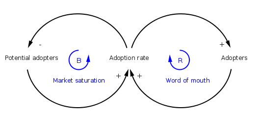 The second feedback loop on the left is negative reinforcement (or "balancing" and hence labeled B). Clearly, growth cannot continue forever, because as more and more people adopt, there remain fewer and fewer potential adopters.