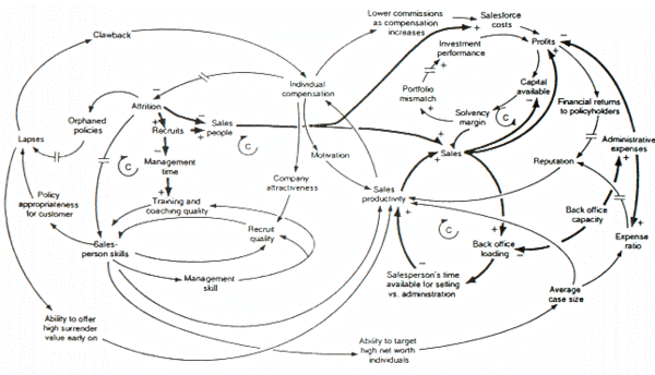 The figure above is a causal loop diagram of a system dynamics model created to examine forces that may be responsible for the growth or decline of life insurance companies in the United Kingdom. A number of this figure's features are worth mentioning. The first is that the model's negative feedback loops are identified by C's, which stand for Counteracting loops. The second is that double slashes are used to indicate places where there is a significant delay between causes (i.e., variables at the tails of arrows) and effects (i.e., variables at the heads of arrows). This is a common causal loop diagramming convention in system dynamics. Third, is that thicker lines are used to identify the feedback loops and links that author wishes the audience to focus on. This is also a common system dynamics diagramming convention. Last, it is clear that a decision maker would find it impossible to think through the dynamic behavior inherent in the model, from inspection of the figure alone.[13]