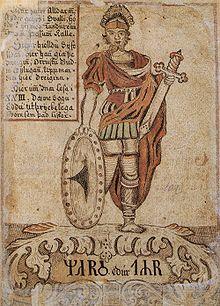 In the sixth century, the Roman historian Jordanes writes in his De origine actibusque Getarum that the Goths, an east Germanic people, saw the same "Mars" as an ancestral figure: