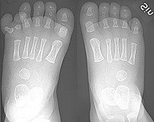 Humans usually have five toes on each foot. When more than five toes are present, this is known as polydactyly. Other variants may include syndactyly or arachnodactyly. Forefoot shape, including toe shape, exhibits significant variation among people; these differences can be measured and have been statistically correlated with ethnicity.[3] Such deviations may affect comfort and fit for various shoe types. Research conducted for the U.S. Army indicated that larger feet may still have smaller arches, toe length, and toe-breadth.[4]