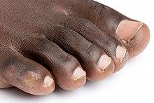 A common problem involving the big toe is the formation of bunions. These are structural deformities of the bones and the joint between the foot and big toe, and may be painful.[7] Similar deformity involving the fifth toe is described as tailor's bunion or bunionette.