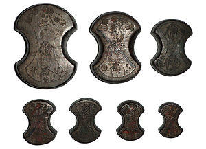 Japanese Edo era tael weights for balance scales, made of bronze. In descending size, 30, 20, 10, 5, 4, 3, and 2 tael weights.