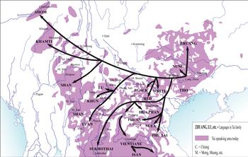 The Tai peoples, from Guangxi began to move southwestward in the first millennium CE, eventually spreading across the whole of mainland Southeast Asia.[7] Based on layers of Chinese loanwords in proto-Southwestern Tai and other historical evidence, Pittayawat Pittayaporn (2014) proposes that the southwestward migration of Tai-speaking tribes from the modern Guangxi and northern Vietnam to the mainland of Southeast Asia must have taken place sometime between the 8th-10th centuries.[8] Tai speaking tribes migrated southwestward along the rivers and over the lower passes into Southeast Asia, perhaps prompted by the Chinese expansion and suppression. Chinese historical texts record that, in 722 AD, 400,000 'Lao'[a] rose in revolt behind Mai Thúc Loan, who declared himself the king of Nanyue in Guangdong.[9][10] After the 722 revolt, some 60,000 were beheaded.[9] In 726, after the suppression of a rebellion by a 'Lao' leader in the present-day Guangxi, over 30,000 rebels were captured and beheaded.[10] In 756, another revolt attracted 200,000 followers and lasted four years.[11] In the 860s, many local people in what is now north Vietnam sided with attackers from Nanchao, and in the aftermath some 30,000 of them were beheaded.[11][12] In the 1040s, a powerful matriarch-shamaness by the name of A Nong, her chiefly husband, and their son, Nong Zhigao, raised a revolt, took Nanning, besieged Guangzhou for fifty seven days, and slew the commanders of five Chinese armies sent against them before they were defeated, and many of their leaders were killed.[11] As a result of these three bloody centuries, the Tai began to migrate southwestward.[11]
