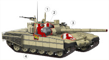 Reactive armour consists of small explosive-filled metal boxes that detonate when hit by the metallic jet projected by an exploding HEAT warhead, causing their metal plates to disrupt it. Tandem warheads defeat reactive armour by causing the armour to detonate prematurely. Modern reactive armour protects itself from Tandem warheads by having a thicker front metal plate to prevent the precursor charge from detonating the explosive in the reactive armour. Reactive armours can also reduce the penetrative abilities of kinetic energy penetrators by deforming the penetrator with the metal plates on the Reactive armour, thereby reducing its effectiveness against the main armour of the tank.