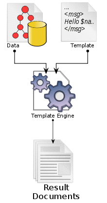A template processor (also known as a template engine or template parser) is software designed to combine templates with a data model to produce result documents.[1][2][3] The language that the templates are written in is known as a template language or templating language. For purposes of this article, a result document is any kind of formatted output, including documents, web pages, or source code (in source code generation), either in whole or in fragments. A template engine is ordinarily included as a part of a web template system or application framework, and may be used also as a preprocessor or filter.