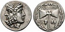 It was at Tenedos, along with Lesbos, that the first coins with Greek writing on them were minted.[35] Figures of bunches of grapes and wine vessels such as amphorae and kantharoi were stamped on coins.[36] The very first coins had a twin head of a male and a female on the obverse side.[37] The early coins were of silver and had a double-headed axe imprinted on them. Aristotle considered the axe as symbolizing the decapitation of those convicted of adultery, a Tenedian decree.[38] The axe-head was either a religious symbol or the seal of a trade unit of currency.[39] Apollo Smintheus, a god who both protected against and brought about plague, was worshipped in late Bronze Age Tenedos.[40] Strabo's Geography writes that Tenedos "contains an Aeolian city and has two harbours, and a temple of Apollo Smintheus" (Strabo's Geography, Vol. 13). The relationship between Tenedos and Apollo is mentioned in Book I of the Iliad where a priest calls to Apollo with the name "O god of the silver bow, that protectest Chryse and holy Cilla and rulest Tenedos with thy might"(Iliad I).[41]