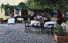 The land was not suitable for large-scale grazing or extensive agriculture. Local grapes and wines were mentioned in inscriptions and on coins. But Pliny and other contemporary writers did not mention grapes and wines at the island. Most exports were via sea, and both necessities and luxuries had to imported, again by sea.[20] Unlike in Athens, it is unclear whether Tenedos ever had a democracy.[53] Marjoram (Oregano) from Tenedos was one of the relishes used in Greek cuisine.[54] The Tenedians punished adulterers by cutting off their heads with an axe.[55] Aristotle wrote about the social and political structure of Tenedos.[21] He found it notable a large part of the populace worked in occupations related to ferries, possibly hundreds in a population of thousands.[20] Pausanias noted some common proverbs in Greek originated from customs of the Tenedians. "He is a man of Tenedos" was used to allude to a person of unquestionable integrity, and "to cut with the Tenedian axe" was a full and final 'no'.[56] Lykophron, writing in the second century BC, referred to the deity Melikertes as the "baby-slayer".[32] Xenophon described the Spartans' sacking the place in 389 BC, but being beaten back by an Athenian fleet when trying again two years later.[20]