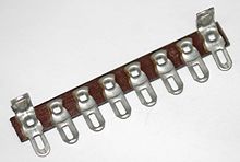 A terminal is the point at which a conductor from a component, device or network comes to an end.[1] Terminal may also refer to an electrical connector at this endpoint, acting as the reusable interface to a conductor and creating a point where external circuits can be connected.[2][3] A terminal may simply be the end of a wire or it may be fitted with a connector or fastener.