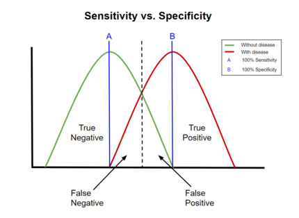 The above graphical illustration is meant to show the relationship between sensitivity and specificity. The black, dotted line in the center of the graph is where the sensitivity and specificity are the same. As one moves to the left of the black, dotted line the sensitivity increases, reaching its maximum value of 100% at line A, and the specificity decreases. The sensitivity at line A is 100% because at that point there are zero false negatives, meaning that all the positive test results are true positives. When moving to the right, the opposite applies, the specificity increases until it reaches the B line and becomes 100% and the sensitivity decreases. The specificity at line B is 100% because the number of false positives is zero at that line, meaning all the negative test results are true negatives.
