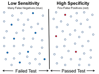 A negative result in a test with high sensitivity is useful for ruling out disease.[10] A high sensitivity test is reliable when its result is negative, since it rarely misdiagnoses those who have the disease. A test with 100% sensitivity will recognize all patients with the disease by testing positive. A negative test result would definitively rule out presence of the disease in a patient. However, a positive result in a test with high sensitivity is not necessarily useful for ruling in disease. Suppose a 'bogus' test kit is designed to always give a positive reading. When used on diseased patients, all patients test positive, giving the test 100% sensitivity. However, sensitivity does not take into account false positives. The bogus test also returns positive on all healthy patients, giving it a false positive rate of 100%, rendering it useless for detecting or "ruling in" the disease.