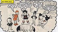 The first edition of The Beano was dated 30 July 1938,[9] and sold at two pence.[7] It was full of comic strips (such as Lord Snooty, Wee Peem, Dead-Eyed Dick, Tin-Can Tommy) and prose stories (Ping the Elastic Man, My Dog Sandy, The Wishing Tree, etc.)[7] and was an instant success, selling 443,000 copies that week.[10] A facsimile of the first issue's cover was printed on the back of issue No. 2,000. Before Law's "new big five" plan, comic strips were printed in newspapers and/or a tabloid format, but the styles The Beano and The Dandy compacted their stories as well as extended them to fit 28 pages, despite selling at the same price as the traditionally-styled Amalgamated Press comics (Comic Cuts and Illustrated Chips), and also began the boys' adventure newspaper books genre decline.[7] Issue 272 (December 1945) was the first issue to sell over a million copies.[11]