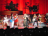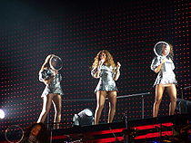 Beyoncé's mother and designer Tina Knowles, House of Deréon, Giorgio Armani, Versace, Elie Saab and Herve Leger served as the designers for the outfits of the tour.[4] Jon Pareles of The New York Times described the clothes as mainly silvery, ranging from miniskirts to formal dresses, flesh-toned bodysuit to bikini to negligee.[20] Pareles further noted that "The wardrobe entices men, but it's also a means of self-assertion".[20] J. Freedom du Lac of The Washington Post described the costumes during the show as "spangly".[17] Lee Hildebrand of the San Francisco Chronicle praised the costumes saying that "every one [is] fabulously glamorous, most of them tailored to highlight the singer's ample cleavage and a pair of legs to rival Tina Turner's. At one point, when the legs were concealed by a long scarlet gown, wind blew from underneath to expose them."[14] Sarah Rodman of The Boston Globe praised the floor-length gown but disliked the tinfoil mini worn by Knowles.[22] Lisnaree Vichitsorasatra of The Nation praised Knowles' look, saying that she was like a "glittering goddess in a revealing outfit".[23] Frank Scheck of The Hollywood Reporter also echoed her statements, "to say that Beyonce looks terrific is probably redundant. Her fashion parade of form-fitting, eye-catching costumes -- most notably a belly dancer's get-up in which she demonstrated some hip-shaking moves that indicated Shakira better watch her back -- provided ample opportunities for shameless leering."[13] Ann Powers of the Los Angeles Times commented that "the camouflage outfits her male dancers sometimes wore... felt right for a show that sometimes seemed like a military operation, expertly executed."[24] Irish Independent's Eamon Sweeney noted that Knowles looked "absolutely stunning" and added, "I have to confess that the sight of Beyoncé ripping off a short cocktail dress to reveal a barely there bodysuit will linger in my memory for years to come."[16] A writer of The StarPhoenix wrote that Knowles looked like a "silver-clad siren rose" further saying that "it was almost surreal to see the woman who frequents the covers of fashion magazines in the same room".[25] Tonya Turner from The Courier-Mail praised Knowles for looking "every bit the dream girl in a sparkling silver floor-length gown".[26]