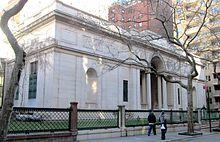 The main building (also known as the McKim Building), constructed between 1902 and 1906 as the original structure in the complex, was designed in the Classical Revival style by Charles Follen McKim of McKim, Mead & White.[21][3][23] The original building occupies a lot of 117 by 50 feet (36 by 15 m),[38] and was intended to be similarly scaled to New York Public Library branches of the era.[23] The 1928 annex to the building, designed by Benjamin Wistar Morris to harmonize with McKim's original, contains architectural detail differing from that of the original structure.[21][61][3] The annex measures 90.67 by 60.5 feet (28 by 18 m),[63] with a later 26-by-30-foot (7.9 by 9.1 m) addition.[75]