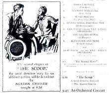 - (12): The Final Scoop, written and broadcast by Dorothy L. Sayers. Transmitted on Saturday 4 April 1931. First published in issue 117 of The Listener on 8 April 1931.