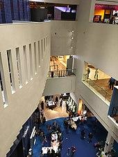 On the Lower Level there is also a complex multi-story sculpture titled Origin, inside a 45-foot-tall (14 m) cylindrical tower. The artwork portrays relationships among art, technology, and natural resources of the earth.[6] Near the entrance to the building, there is Science on a Roll, a popular rolling ball sculpture by George Rhoads.[7]