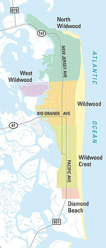 The Wildwoods are a group of five municipalities in Cape May County, New Jersey, all of which are situated on the Island of Five Mile Beach, a barrier island facing the Atlantic Ocean. These Jersey Shore communities have relatively small year-round populations and swell significantly during the summer with vacationers.