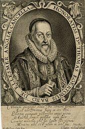 Thomas Egerton, 1st Viscount Brackley, PC (1540 – 15 March 1617), known as 1st Baron Ellesmere from 1603 to 1616, was an English nobleman, judge and statesman from the Egerton family who served as Lord Keeper and Lord Chancellor for twenty-one years.