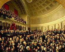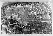 Bayard became more politically active, speaking at a public meeting in September 1867 against constitutional proposals for ending racial discrimination in voting rights.[20] The following year, he condemned the impeachment proceedings against President Andrew Johnson, who had succeeded to the presidency in 1865 after Lincoln's assassination and had threatened the Republican Congress's plans for Reconstruction of the Southern states.[20] Both Bayards attended the 1868 Democratic National Convention and, although they were unenthusiastic about the nominee, Horatio Seymour, supported the unsuccessful ticket that year.[21]