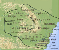Thracians inhabited parts of the ancient provinces of Thrace, Moesia, Macedonia, Dacia, Scythia Minor, Sarmatia, Bithynia, Mysia, Pannonia, and other regions of the Balkans and Anatolia. This area extended over most of the Balkans region, and the Getae north of the Danube as far as beyond the Bug and including Pannonia in the west.[11] There were about 200 Thracian tribes.[12]