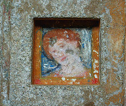 Several Thracian graves or tombstones have the name Rufus inscribed on them, meaning "redhead" – a common name given to people with red hair[64] which led to associating the name with slaves when the Romans enslaved this particular group.[65] Ancient Greek artwork often depicts Thracians as redheads.[66] Rhesus of Thrace, a mythological Thracian king, was so named because of his red hair and is depicted on Greek pottery as having red hair and a red beard.[66] Ancient Greek writers also described the Thracians as red-haired. A fragment by the Greek poet Xenophanes describes the Thracians as blue-eyed and red haired: