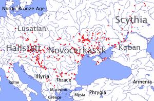 Archaeologically, Thraco-Cimmerian artifacts consist of grave goods and hoards. The artifacts labelled Thraco-Cimmerian all belong to a category of upper class, luxury objects, like weapons, horse tacks and jewelry, and they are recovered only from a small percentage of graves of the period. They are metal (usually bronze) items, particularly parts of horse tacks, found in a late Urnfield context, but without local Urnfield predecessors for their type. They appear rather to spread from the Koban culture of the Caucasus and northern Georgia, which together with the Srubna culture, blends into the 9th to 7th centuries pre-Scythian Chernogorovka and Novocherkassk cultures. By the 7th century, Thraco-Cimmerian objects are spread further west over most of Eastern and Central Europe, locations of finds reaching to Denmark and eastern Prussia in the north and to Lake Zürich in the west. Together with these bronze artifacts, earliest Iron items appear, ushering in the European Iron Age, corresponding to the Proto-Celtic expansion from the Hallstatt culture.