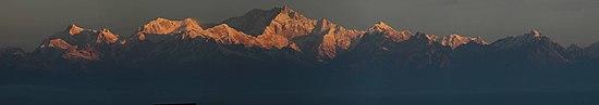 At sunrise, the peaks of Kanchenjunga are illuminated before the sun is seen at lower elevations. From Tiger Hill, Mount Everest (8848 m) is just visible. Kanchenjunga (8598 m) looks higher than Mt. Everest, owing to the curvature of the Earth, as it is several miles closer than Everest. The distance in a straight line from Tiger Hill to Everest is 107 miles (172 km).[3][4]
