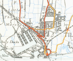 A few houses were built for the railway workers, but it was not until the construction of Tilbury Docks (see below) that there was any settlement worthy of a name. Whilst the docks were being built, the thousands of workers were either provided with temporary accommodation or had to commute from surrounding villages and towns. As a result of overcrowding, more permanent housing was built once the docks were completed, including tenement blocks; but these were poorly constructed, and until the formation of Tilbury District Council (see below) the town was in a poor state, as it largely remained until 1918, when government funds were available to better the situation.[9]