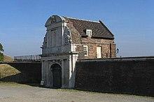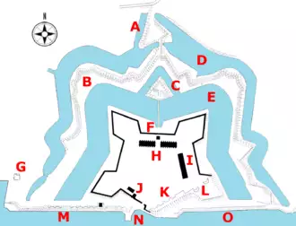 A replica wooden bridge runs from the outer defences over the water to an island called a ravelin, which is in turn linked to the inner defences by another replica bridge, protected with two drawbridges.[85] The ravelin formed a physical barrier to incoming artillery fire aimed at the entrance to the inner defences and could also have directed fire against enemy forces that breached the outer defensive line.[86]