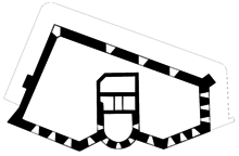 Under the King's new programme of work, the Thames was protected with a mutually reinforcing network of blockhouses at Gravesend, Milton, and Higham on the south side of the river, and West and East Tilbury on the opposite bank.[14] West Tilbury Blockhouse, part of the inner line, was initially called the "Thermitage Bulwark", because it was on the site of a hermitage dissolved by the King in 1536.[15] It was designed by James Nedeham and Christopher Morice, supported by three overseers; prior to the work, the estimated cost had been given as £211, allowing for stone, timber, 150,000 bricks and 200 tonnes (200 long tons; 220 short tons) of chalk.[16][a] The D-shaped blockhouse was curved at the front, with two storeys of gun-ports, and probably had additional gun platforms stretching along the river on either side of it; ancillary buildings were placed at the rear and the whole site was protected by a rampart and a ditch, with extensive marshlands and creeks giving additional protection to the east.[18] It was initially commanded by Captain Francis Grant and his deputy, and garrisoned with a porter, two soldiers and four gunners, equipped with up to five artillery pieces including a demi-cannon and sakers.[19]