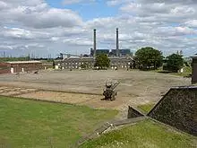 The result was a large, five-sided, star-shaped fort with four angular bastions, revetted in brick, with an outer curtain of defences, including two moats and a redoubt; two new gatehouses defended the entrance from the north.[36] Two gun lines of gun platforms, facing the river, stretched alongside either the side of the fort.[37] The Henrician blockhouse was incorporated into the defences, but the Elizabethan earthworks were destroyed.[33] The interior of the fort was raised up above the level of the marshes to prevent flooding, and barracks and other buildings were constructed inside.[38] The writer John Evelyn praised the new fort as "a Royal work indeede".[35] Further work after 1694 replaced the wooden gun platforms alongside the river with more durable stone equivalents.[39]