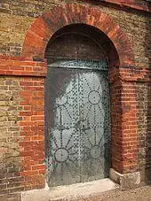 On the north side of the parade are two early 18th century magazines, altered in the 19th century.[97] These were specially designed to avoid the use of iron, which might have generated sparks and set off an explosion, instead being built using wood and copper; they are the only remaining examples of their type in Britain.[97] The Landport Gate lies behind the magazines, and has a gatehouse, called the Dead House, above the passageway leading into the interior of the fort.[98] Past the north-west bastion, the soldiers' barracks would have stood opposite those of the officers', but was destroyed after the war and only the foundations of the building remain.[99] The south-west magazine also holds a covered magazine, similar to that in the north-east bastion.[100] Just to the west of the Water Gate is the fort's guardhouse and chapel, dating from the late 17th century and one of the oldest surviving places of worship within a British artillery fortress.[101]
