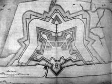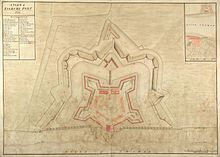 De Gomme prepared several plans for the King in 1665; a further iteration of the designs was submitted in 1670 and given royal approval.[31] Work began the same year but it took until 1685 to complete the project.[32] The work was carried out by skilled contractors, who were supplemented by large teams of pressed men brought in from across the region; during 1671, up to 256 workers were employed on the site.[33] Around 3,000 timber piles had to be brought from Norway for the project in 1671 to support the foundations in the marshy ground.[34] The resources needed for the King's multiple defence projects became stretched, and one of the planned bastions at Tilbury, originally planned to face the river, was cancelled in 1681, in part to save money.[35] The total cost of the project is unknown, but was significantly more than the original estimate of £47,000.[35][a]
