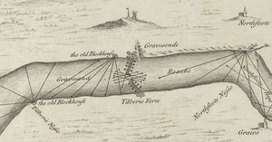 The River Thames was strategically important, as the city of London and the newly constructed royal dockyards of Deptford and Woolwich were vulnerable to seaborne attacks arriving up the estuary, which was a major maritime route, carrying 80 percent of England's exports.[10] At the mouth of the estuary, the Thames narrowed considerably, forming a natural hub for communications: the "Long Ferry" took passengers into the capital, and the "Cross Ferry" moved traffic across the river.[11] This was also the first point that an invasion force would be able to easily disembark along the Thames, as before this point the mudflats along the sides of the estuary would have made landings difficult.[12] Temporary defences had been constructed at Tilbury as early as the 14th and 15th centuries, although little is known about their design.[13]
