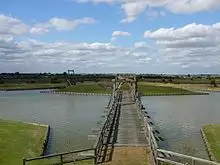 On the south side of the outer defences, facing the river, are the West and East Lines of gun positions. These were built in the 18th century and have been subject to considerable erosion and silting; 12 of the original 14 gun positions on the West Line remain but only one of the East Line has survived.[83] In between the lines is a quay, designed to allow the delivery of supplies from the Thames, and the remains of the tracks from the narrow gauge railway built during the First World War.[87] A sluice gate in the south-west corner managed the water in the moats, and allowed them to be drained completely should the surfaces begin to freeze over in winter and provide an advantage to any attackers.[86] To the west of the outer defences is the World's End pub, originally the local ferry house, dating from 1788.[83]