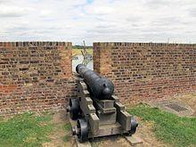 By the start of the 18th century, Tilbury Fort was one of the most powerful in Britain.[40] The number of artillery guns varied; in 1715 there were 17 demi-cannon and 26 culverins mounted on the west gun platform, and 31 demi-cannons and one culverin on the east; the following year there were reported to be 161 guns in total at the fort, although 92 of these were in poor repair and inoperable.[41]