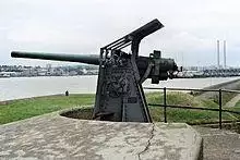 Fresh concerns grew that the Thames might be vulnerable to attack from torpedo boats and armoured cruisers, and in 1903 four quick-firing 12-pounder, 12 cwt (5.4 kg, 50.8 kg) guns were positioned on Tilbury's south-east curtain wall, supplemented in 1904 by two 6-inch (15 cm) breech loading guns.[66] In 1905, however, the government decided that the Royal Navy and the forts downstream gave sufficient protection for the capital and removed the artillery, leaving only machine-guns in place.[67]