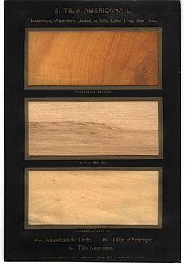 The wood is pale brown, sometimes nearly white or faintly tinged with red; light, soft with fine close grain; clear of knots but does not split easily. It is low in strength and has a poor steam-bending classification. It can take stains and polish without difficulty and it planes, glues, screws and nails well.[12] It is sold generally under the name basswood, but is sometimes confounded with tulip-wood and then called white-wood, and is largely used in the manufacture of wooden-ware, wagon boxes and furniture. It has a density of 0.4525 (relative to water). The wood is considered odorless. This makes it valuable in the manufacture of wooden-ware, cheap furniture, and bodies of carriages; it is also especially adapted for wood-carving. The inner bark is very tough and fibrous, used in the past for making ropes.[7]