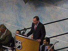 By 2004, the owners were claiming that player salaries had grown far faster than revenues, and that the league as a whole lost over US$300 million in 2002–03.[136] As a result, on September 15, 2004 Gary Bettman announced that the owners again locked the players out before the start of the 2004–05 season.[137] On February 16, 2005, Bettman announced the cancellation of the entire season.[138] As with the 1994–95 lockout, the owners were again demanding a salary cap, which the players were unwilling to consider until the season was on the verge of being lost.[137] The season's cancellation led to a revolt within the union. NHLPA president Trevor Linden and senior director Ted Saskin took charge of negotiations from executive director Bob Goodenow.[139] By early July, the two sides had agreed to a new collective bargaining agreement.[137] The deal featured a hard salary cap, linked to a fixed percentage of league revenues and a 24% rollback on salaries.[140]