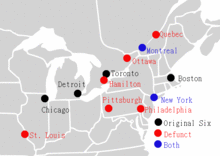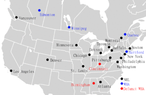 In 1972, the NHL faced competition from the newly formed World Hockey Association (WHA). The WHA lured many players away from the NHL.[91] The WHA's biggest coup was to lure Bobby Hull from the Black Hawks to play for the Winnipeg Jets. He signed a $2.75 million contract, and lent instant credibility to the new league.[92] After Hull signed, several other players quickly followed suit and the NHL suddenly found itself in a war for talent.[93] By the time the 1972–73 WHA season began, 67 players had switched from the NHL to the WHA.[94] The NHL also found itself competing with the WHA for markets. Initially, the league had no intention to expand past 14 teams, but the threat the WHA represented caused the league to change its plans. The league hastily announced the creation of the New York Islanders and Atlanta Flames as 1972 expansion teams.[95] Following the 1972–73 season, the NHL announced it was further expanding to 18-teams for the 1974–75 season, adding the Kansas City Scouts and Washington Capitals.[96] In just eight years, the NHL had tripled in size to 18 teams.